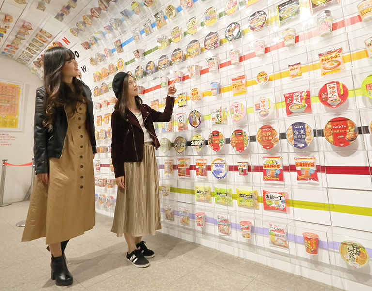 スタッフにカップを渡します。麺を逆さに置き、カップを上からかぶせてセット完了。選んだスープと具を入れてもらい、ふたをしてシュリンク包装。それをエアパッケージにセットして空気を入れれば世界に一つのマイカップヌードルが完成。
