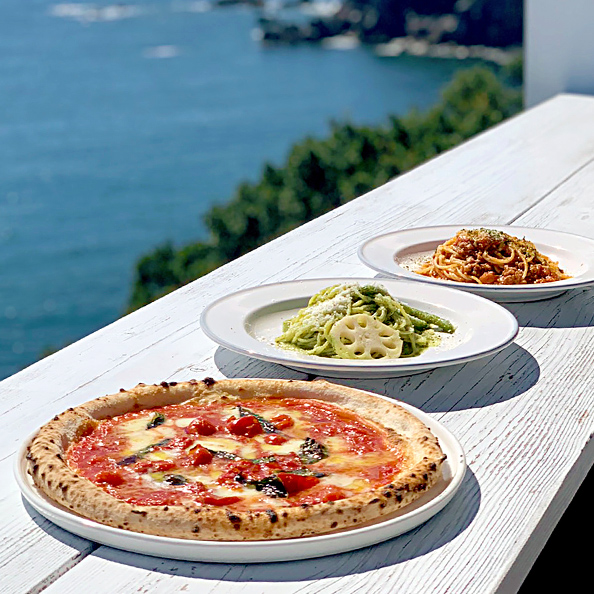地中海沿岸の町をイメージした、明るく開放的なカフェ。海側の一角が全面窓で、開放感いっぱいです。人気は、オーダー後に石窯で焼き始めるナポリピザ。特に写真の「燻製モッツァレラのマルゲリータ(1,550円)」は香りが最高です。契約農家から届くフレッシュバジルたっぷりの濃厚な「ジェノベーゼ(写真中央/1,350円)」など、パスタもおすすめ。食後やティータイムには、オリジナルブレンドの深煎りコーヒーを、手作りケーキと一緒にぜひどうぞ。地下にはアウトドアショップ「BRUNT(ブラント)」もあります。