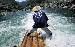 600年以上の歴史を誇る「筏流し」は、木材を新宮市に運ぶための高度な技術でした。昭和30年代後半、ダム建設によって木材はトラック輸送へ移行。そこで筏師の技を伝えるため、観光筏下りが始まります。丸太8本で作る1つの筏を7床つなげて全長30mに。それを3~4人の筏師が人力で操舵し、絶景の中、北山川の急流を下ります。迫力も爽快感も満点!なお伝統的な筏流しの姿を今に伝える全国唯一の例として、「北山川筏流し技術」は、日本森林学会から「2022年度 林業遺産」に認定されました。